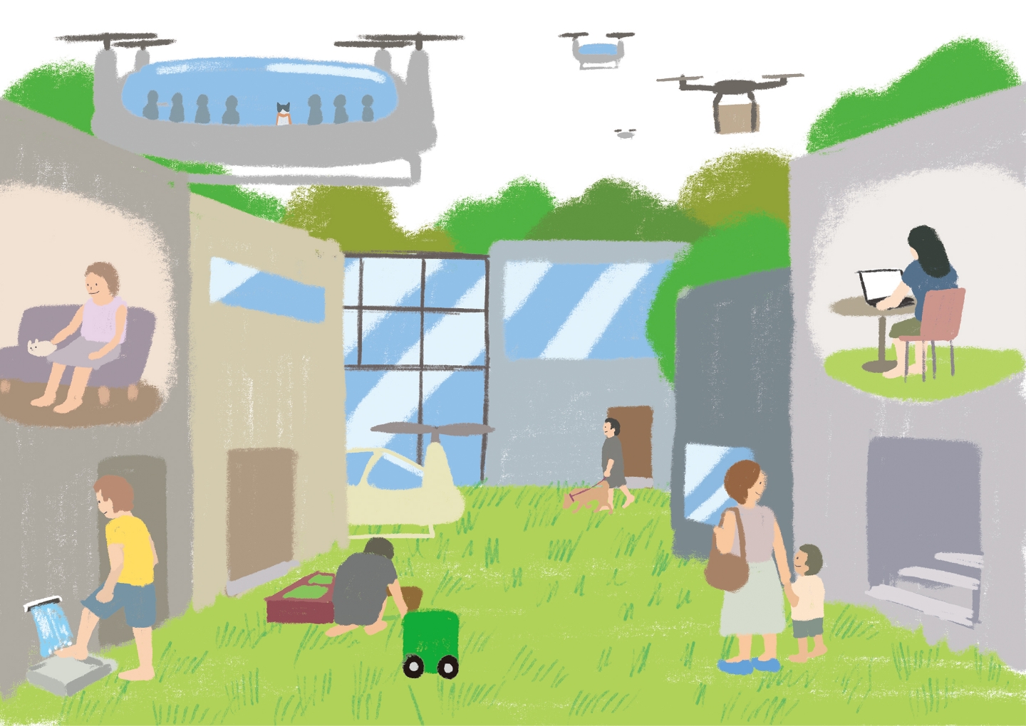 道路や各家庭の庭はドローンの発着場所としても活用されます。